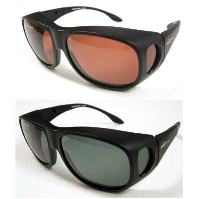 These attractive black colored frame sunglasses can be worn over prescription glasses or alone. The lenses, in addition to providing protection from UVA & UVB rays, eliminate glare that interferes with vision and are scratch resistant. The top ledge and wide side panels shield the eyes from the sun. Select either copper or gray lenses.